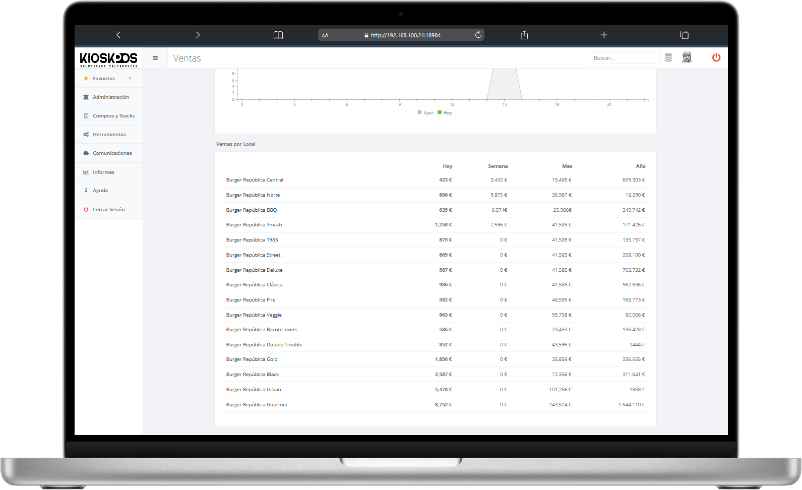 En conjunto con ÁgoraPos ofrecemos ver en cualquier parte del mundo que tengas conexion a Internet, la posibilidad de ver las estadisticas de tu negocio, tanto como si tienes un local como si tienes 100 locales todo en el mismo sitio. Tanto los locales como los kioscos de cada local, para una mejor gestion en tiempo real.